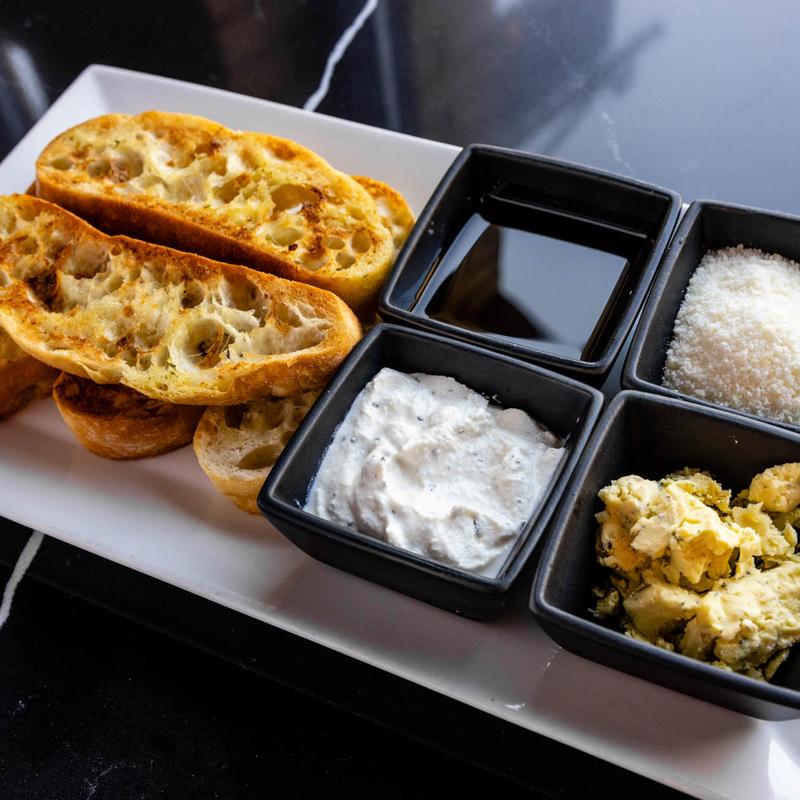 Grated parmesan, garlic butter, garlic olive oil, whipped ricotta.