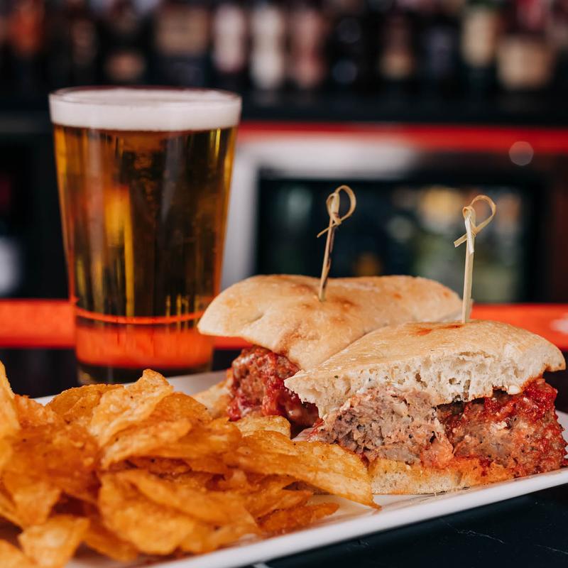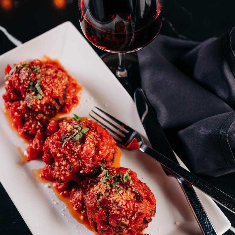 Meatballs, red sauce, provolone, parmesan, whipped ricotta, garlic spread.