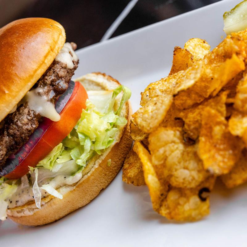 beef patty, white cheddar, bacon jam, gio aioli, lettuce, tomato, onion, brioche bun, served with chips and a pickle