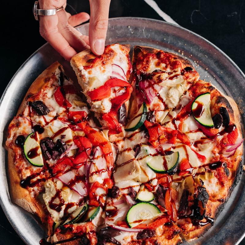 Red sauce, goat cheese, mozzarella, artichokes, Kalamata olives, onions, roasted red peppers, zucchini, balsamic glaze.
