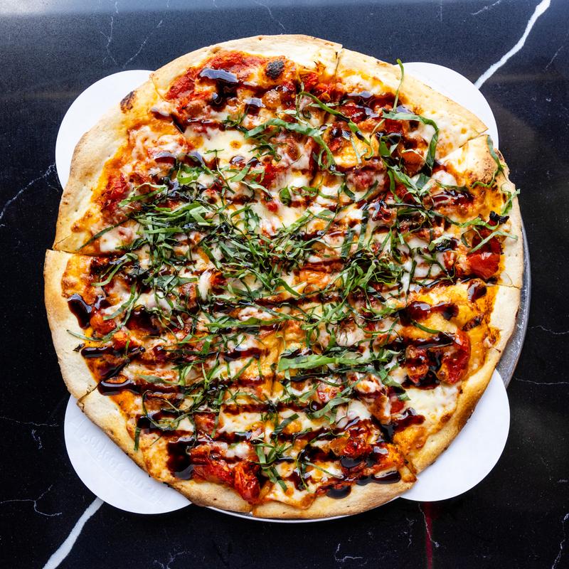 Red sauce, mozzarella, basil, marinated tomatoes, drizzle of balsamic glaze.