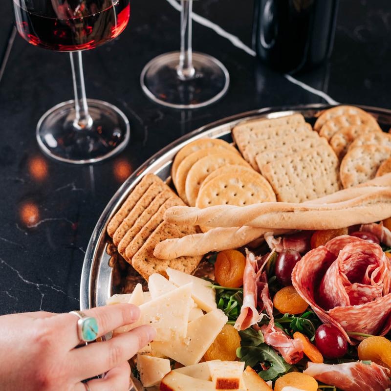 Meat, cheese, crackers, olives, cornichons, fruit.