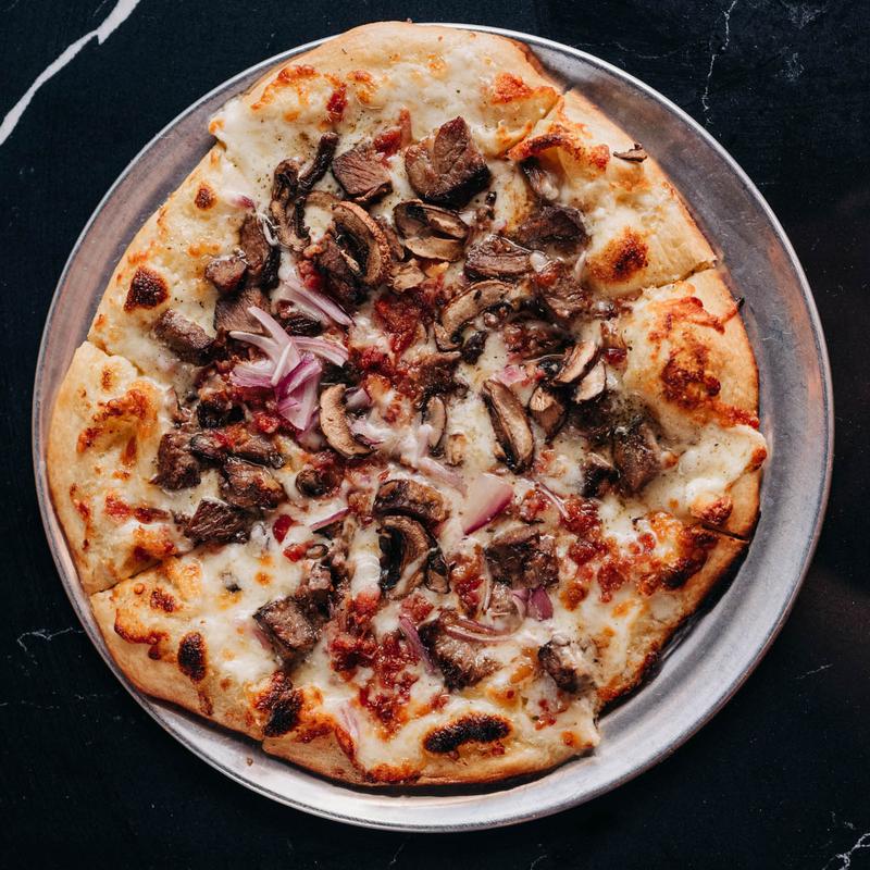 Alfredo sauce, mozzarella, Swiss, bacon, shredded beef short rib, onions, mushrooms.