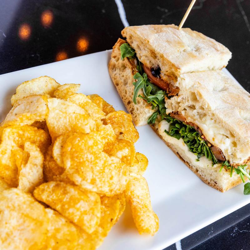 Mozzarella, arugula, tomatoes, garlic spread, balsamic glaze.