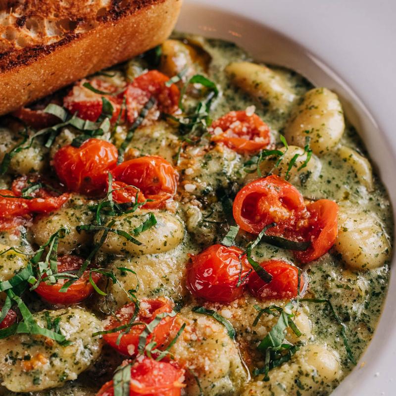 Gnocchi, pesto cream sauce, roasted tomatoes, parmesan, basil.