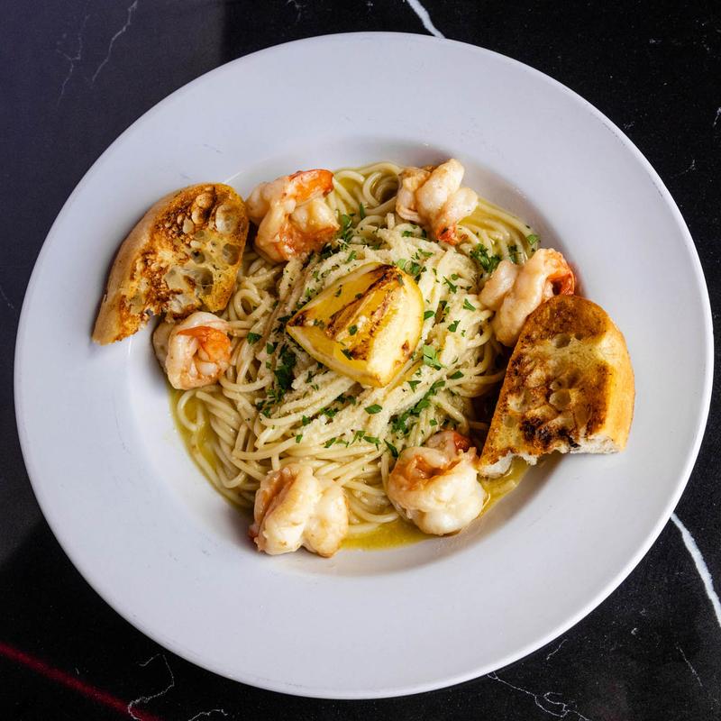 Spaghetti, olive oil, butter, white wine, lemon, chili flakes, parmesan, shrimp