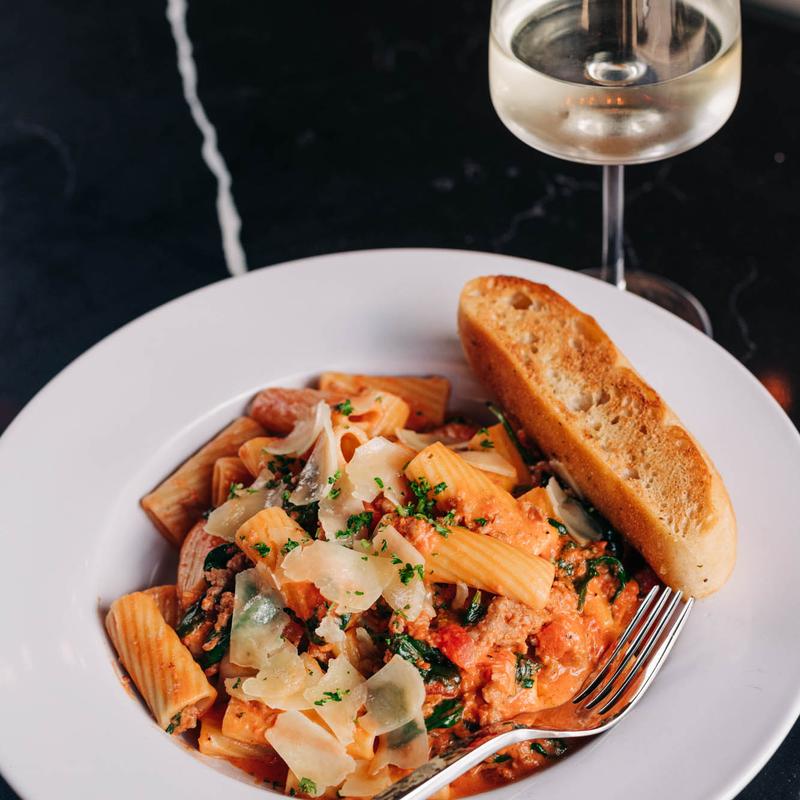 Rigatoni, tomato-spinach sauce, Italian sausage, parmesan, parsley.